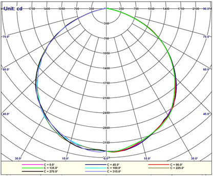 可见光从LED发射出后在空间上呈一定的光强分布(也就是配光曲线),典型的分布如下图所示(参考文献6)