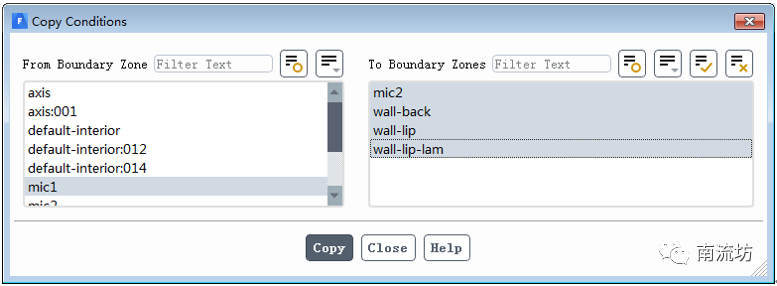 (5)在边界条件面板中,单击Copy按钮弹出Copy Conditions对话框。From Boundary Zone选择mic1,To Boundary Zones选择mic2,wall-back,wall-lip和wall-lip-lam,单击Copy按钮确认退出。
