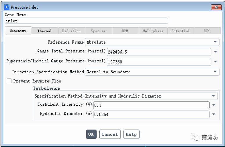 (2)在边界条件面板中,双击inlet,弹出边界条件设置对话框。在Gauge Total Pressure填入242496.5,Supersonic/Initial Gauge Pressure填入127360,单击OK按钮确认退出。