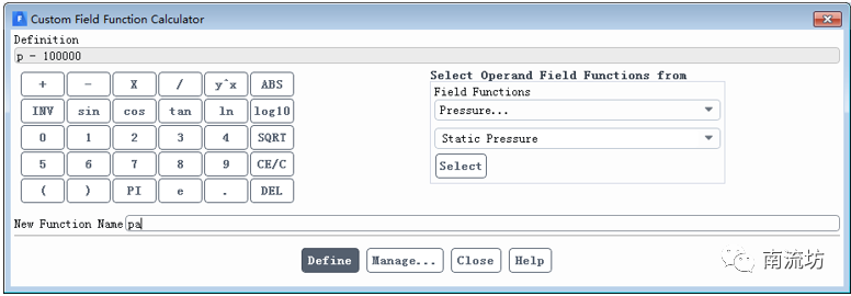 (3)单击主菜单中User-Defined→Field Functions→Custom按钮,弹出Custom Field Function Calculator对话框。自定义变量pa的表达式为p-100000。