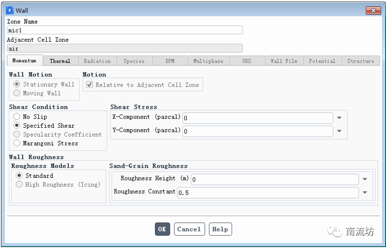 (4)在边界条件面板中,双击mic1弹出边界条件设置对话框。在Shear Condition中选择Specified Shear,在Shear Stress中X-Component和Y-Component分别输入0,单击OK按钮确认退出,单击OK按钮确认退出。