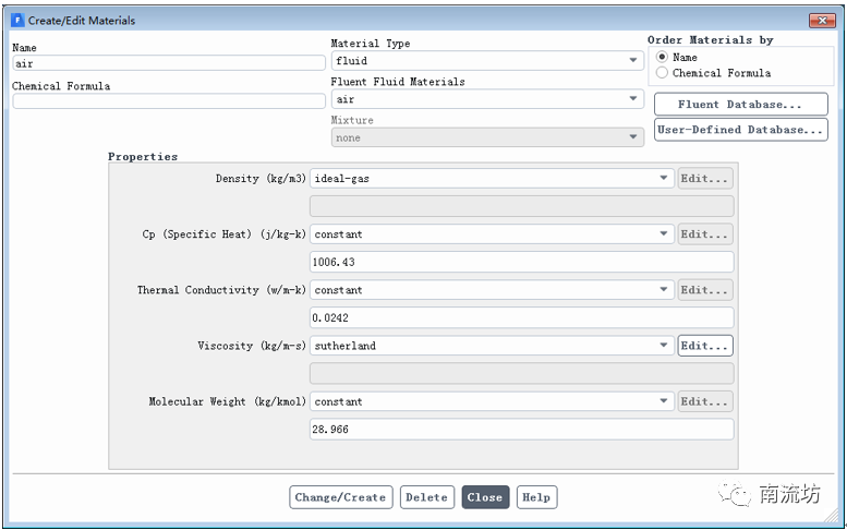 单击主菜单中Physics→Materials→Create/Edit弹出所示Create/Edit Materials(材料)对话框。Density选择ideal-gas,Viscosity选择Sutherland,单击Change/Create按钮并关闭Fluent Database Materials对话框。