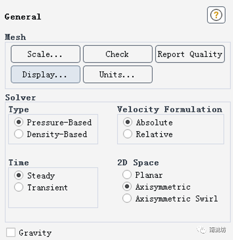 (1)单击命令结构树中General按钮,弹出General(总体模型设定)面板,在Solver中Time选择Steady,在2D Space中选择Axisymmetric,进行稳态计算。