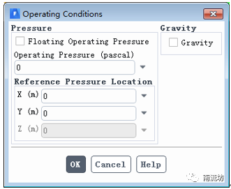 (3)单击主菜单中Physics→Solver→Operating Conditions按钮弹出Operating Conditions对话框。在Operating Pressure中填入0,单击OK按钮并关闭对话框。