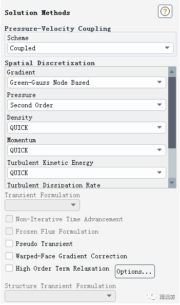 (2)单击主菜单中Solve→Methods按钮,弹出Solution Methods(求解方法设置)面板。Transient Formulation选择Second Order Implicit。