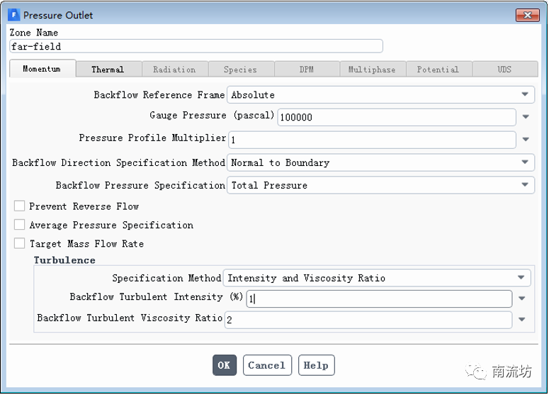 (3)在边界条件面板中,双击outlet弹出边界条件设置对话框。在Gauge Pressure中输入100000,单击OK按钮确认退出,单击OK按钮确认退出。