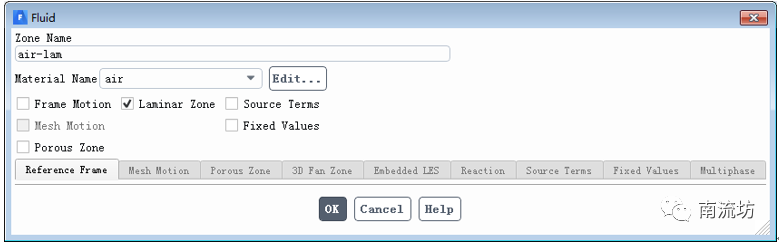 (2)在Cell Zone Conditions面板中,双击air-lam,弹出计算域设置对话框,勾选Laminar Zone,单击OK按钮并关闭对话框。