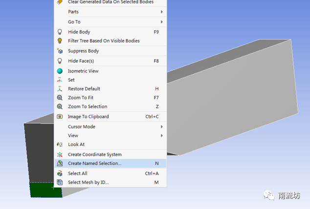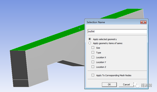 (2)分别右键选择壁面,在弹出快捷菜单中选择Create Named Selection,弹出Selection Name对话框,输入名称inlet和outlet,单击OK按钮确认。