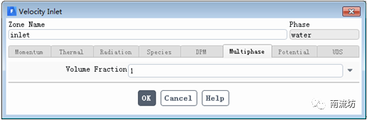 在边界条件面板中phase选择water,双击inlet弹出如图5-45所示的边界条件设置对话框。Volume Fraction输入1,单击OK按钮确认退出。