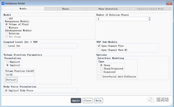 (2)在模型设定面板Models中双击Multiphase按钮,弹出Multiphase Model(多相流模型)对话框,选择VOF,勾选Implicit Body Force,单击OK按钮确认并关闭对话框。