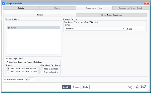 (4)在Phase Interaction对话框中,勾选Surface Tension Force Modeling,Surface Tension Coefficient填入0.072,单击OK按钮确认退出。