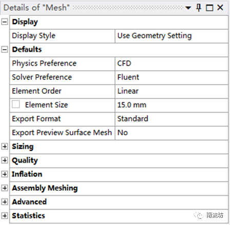 (5)网格参数设置,在Element Size中输入15mm,在Quality中,Smoothing选择High。