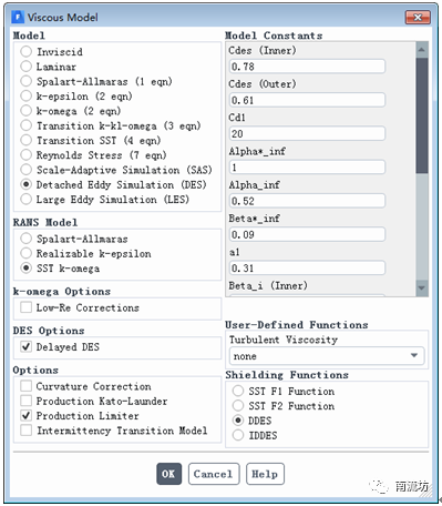 (5)在模型设定面板Models中双击Viscous按钮,弹出Viscous Model(湍流模型)对话框,在Model中选择Detached Eddy Simulation(DES),在RANS Model中选择SST k-omega,单击OK按钮确认并关闭对话框。
