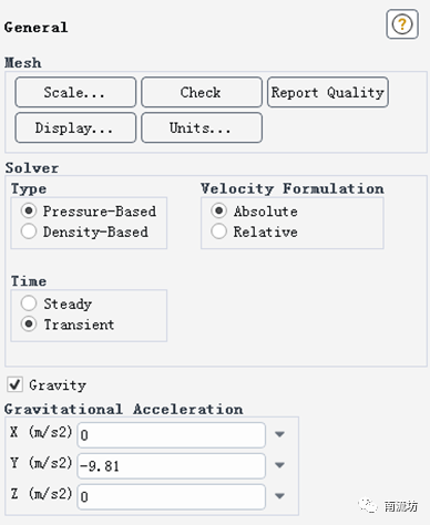 (1)单击命令结构树中General按钮,弹出General(总体模型设定)面板。在SolverTime中选择Transient,勾选Gravity,Y填入-9.81。