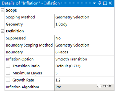 (3)右键单击模型树中Mesh选项,依次选择Mesh→Insert→Inflation。boundary选择渠道底面,在Maximum Layers中输入5。