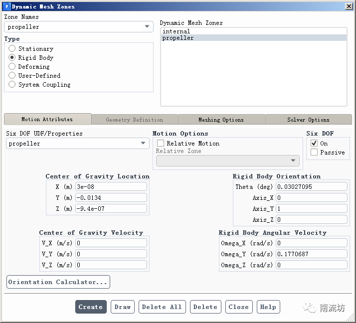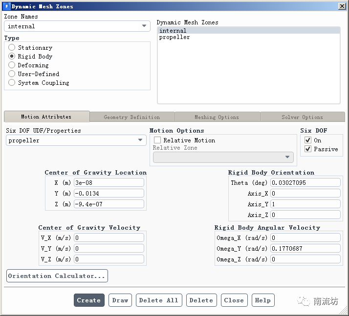 (2)在Dynamic Mesh Zones中,分别对propeller壁面和internal内部计算域设置动网格参数,注意在设置internal内部计算域时要勾选Passive。