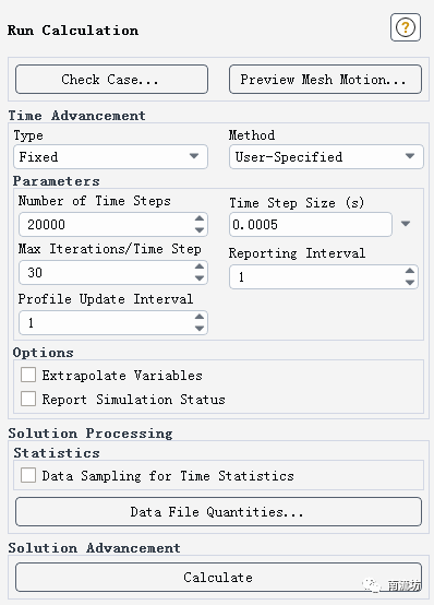 在Time Step Size中输入5e-4,在Number of Time Steps中输入20000,单击Calculate开始计算。