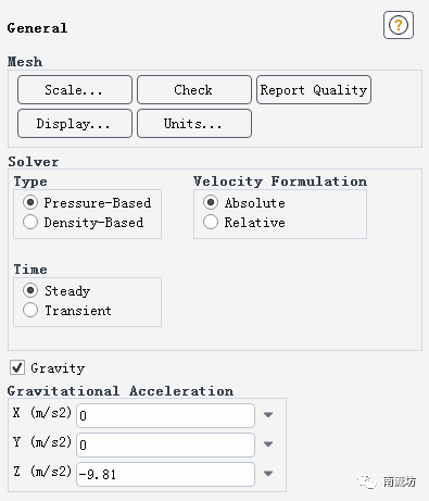 (1)单击命令结构树中General按钮,弹出General(总体模型设定)面板。在SolverTime中选择Steady,勾选Gravity,Z填入-9.81。