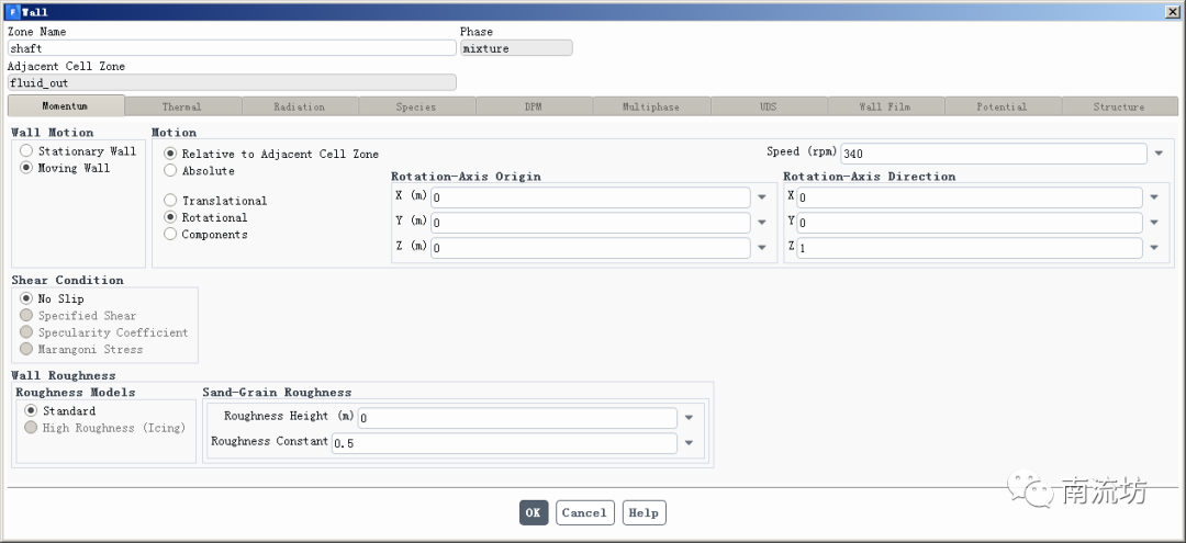 (4)在边界条件面板中,双击shalft弹出边界条件设置对话框。Wall Motion选择Moving Wall,Motion选择Rotational,Speed输入340rpm,单击OK按钮确认退出。