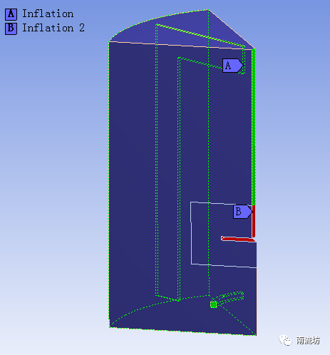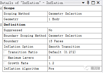 (5)右键单击模型树中Mesh选项,依次选择Mesh→Insert→Inflation。boundary选择管道壁面,在Maximum Layers中输入5。