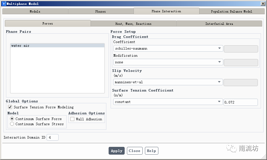 (4)在Phase Interaction对话框中,勾选Surface Tension Force Modeling,Surface Tension Coefficient填入0.072,单击OK按钮确认退出。