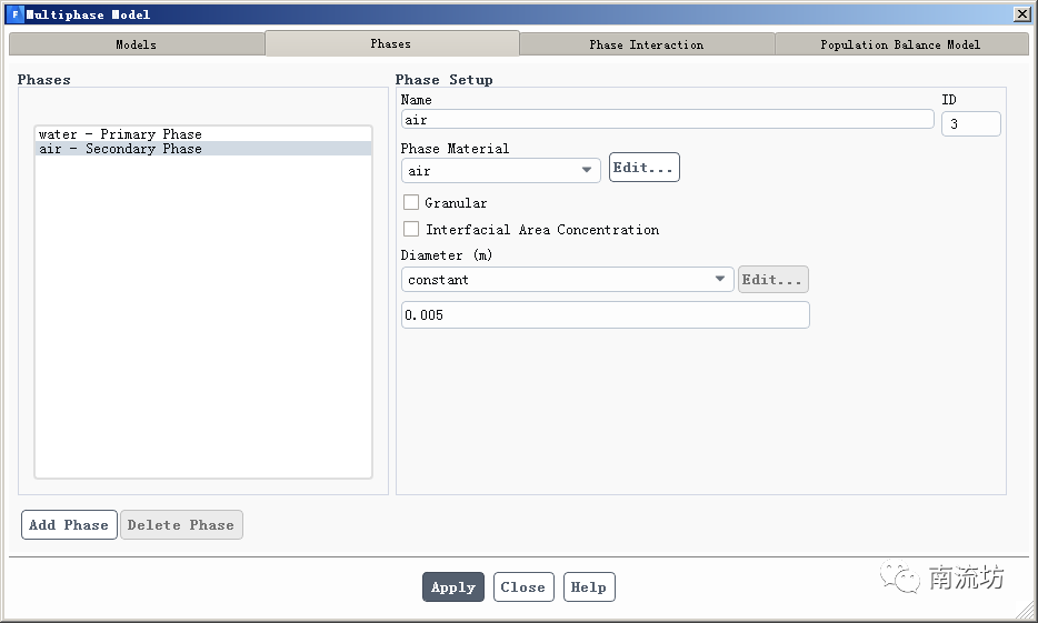 (3)在模型设定面板Models中双击Multiphase下的Phases按钮,弹出Phase(多相流设置)对话框,在Phase-1对话框中,Phase Material选择water-liquid,在Phase-2对话框中,Phase Material选择air,单击OK按钮确认并关闭对话框。