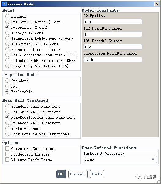 (5)在模型设定面板Models中双击Viscous按钮,弹出Viscous Model(湍流模型)对话框,在Model中选择Realizable k-epsilon(2eqn),单击OK按钮确认并关闭对话框。