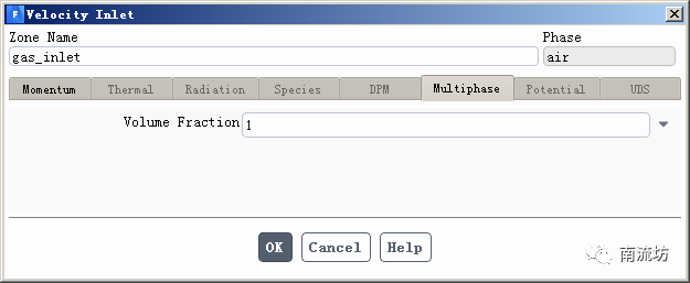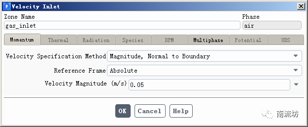 (3)在边界条件面板中,选择gas_inlet,Type选择velocity inlet,phase选择phase-2,弹出边界条件设置对话框。Velocity Magnitude输入0.05,在Multiphase选项卡中,Volume Friction输入1,单击OK按钮确认退出。