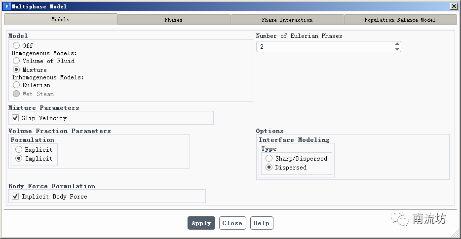 (2)在模型设定面板Models中双击Multiphase按钮,弹出Multiphase Model(多相流模型)对话框,选择Mixture,勾选Implicit Body Force,单击OK按钮确认并关闭对话框。