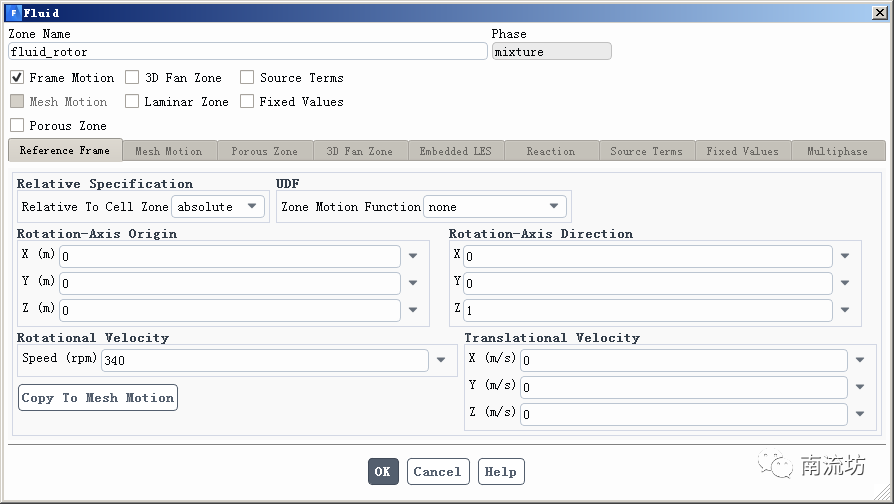 (5)在Cell Zone Conditions中,双击fluid_rotor弹出边界条件设置对话框。勾选Frame Motion,Rotational Velocity输入340rpm,单击OK按钮确认退出。