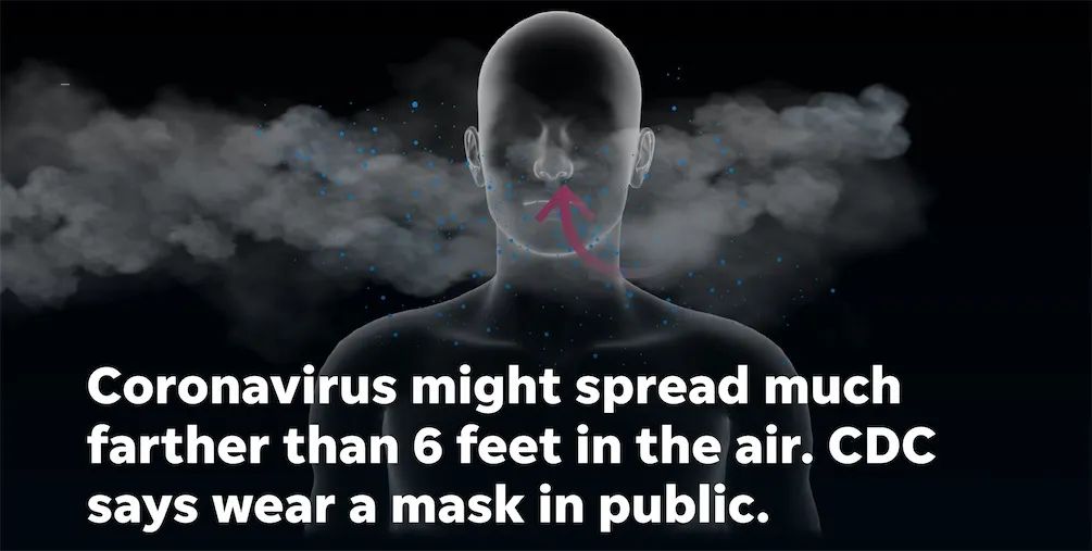 病毒液滴可以在空气中迅速扩散。咳嗽产生的水滴会扩散到一米外的人的脸,脖子和衣服上。在两米处,由于重力将载流液滴拉到地面,则风险会大大降低。