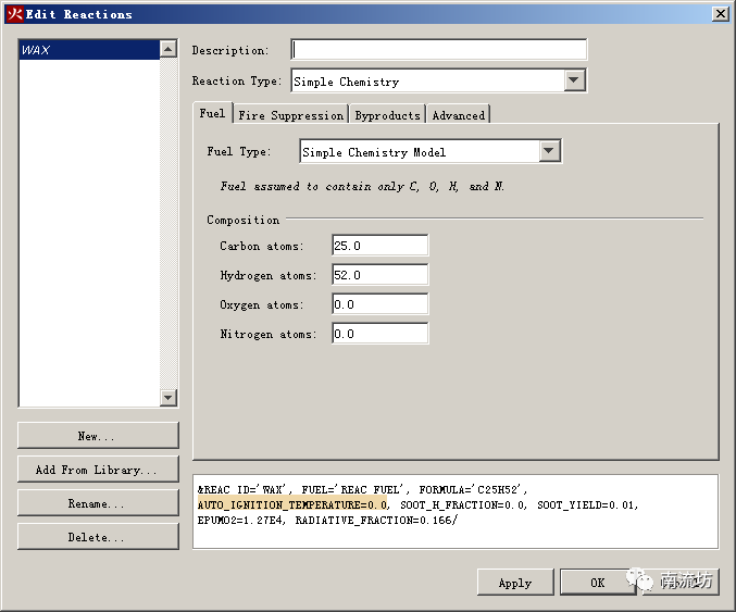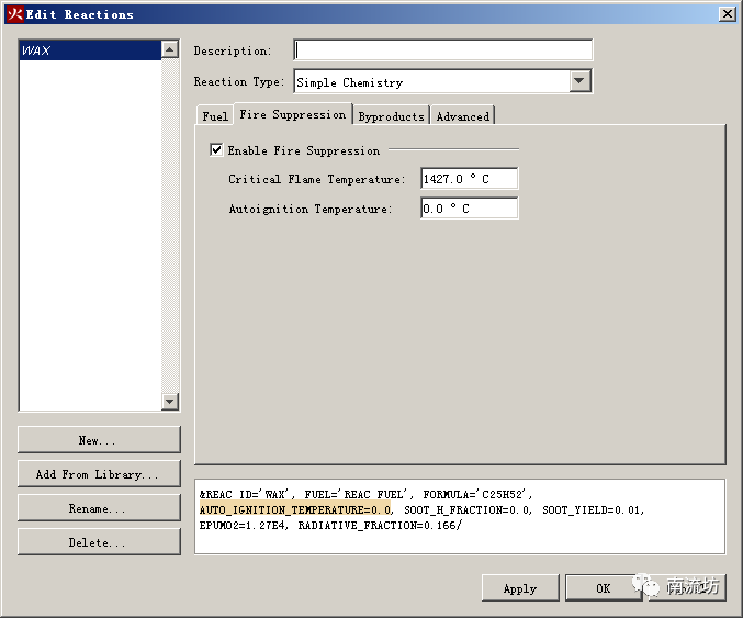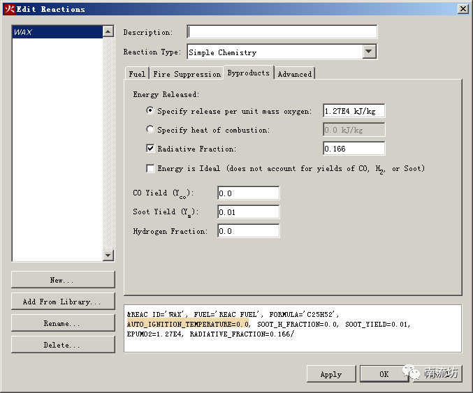 (3)在Edit Reactions对话框中设置WAX燃烧反应参数。