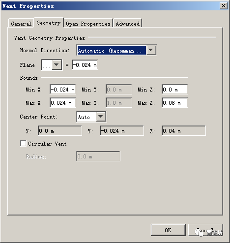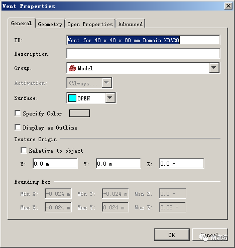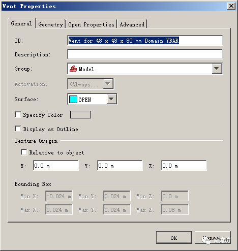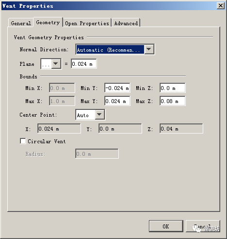 (3)单击主菜单Model→New Vent按钮,弹出Vent Properties对话框。设置蜡烛四周壁面为开敞边界。