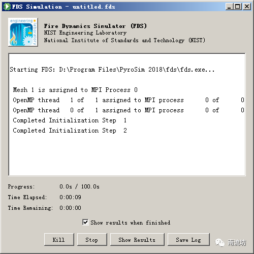 (1)单击主菜单Analysis→Run FDS按钮,弹出FDS Simulation对话框开始计算。