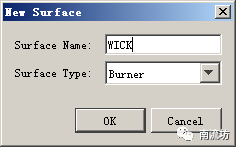 (2)单击New按钮,定义新的边界类型,命名为WICK,Surface Type选择为burner,单击OK按钮。