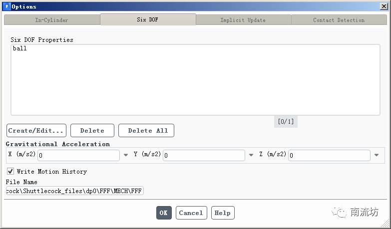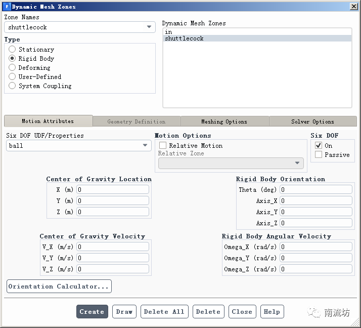 (1)双击Dynamic Mesh按钮,弹出Dynamic Mesh面板,options中勾选Six DOF,单击Settings按钮弹出options对话框,分别创建Six DOF模型。