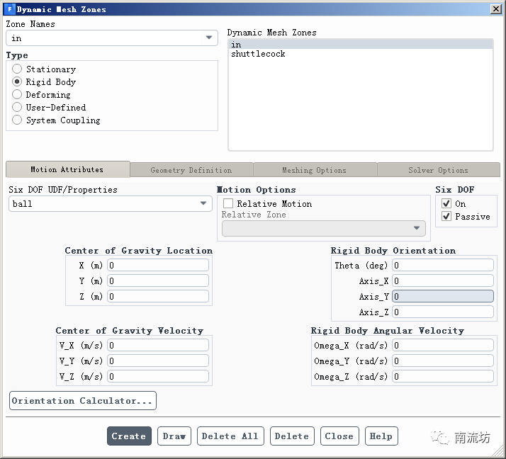 (2)在Dynamic Mesh Zones中,分别对shuttlecock壁面和in内部计算域设置动网格参数,注意在设置in内部计算域时要勾选Passive。