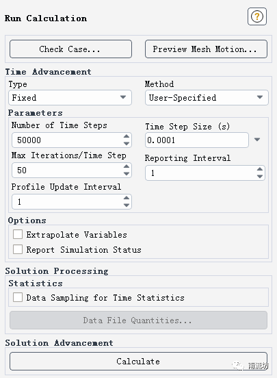 在Time Step Size中输入1e-4,在Number of Time Steps中输入50000,单击Calculate开始计算。
