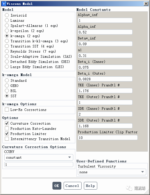 (1)在模型设定面板Models中双击Viscous按钮,弹出Viscous Models对话框,勾选SST k-omega模型,勾选Curvature Correction。
