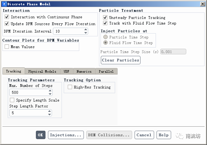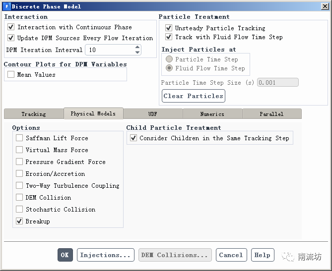 (1)在模型设定面板Models中双击Discrete Phase按钮,弹出Discrete Phase Model(离散相模型)对话框,勾选Interaction with Continuous Phase,DPM Interation Interval处输入10,激活Breakup模型。