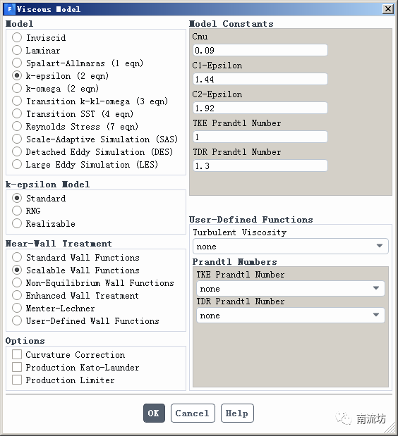 (1)在模型设定面板Models中双击Viscous按钮,弹出Viscous Models对话框,勾选Standard k-epsilon模型。