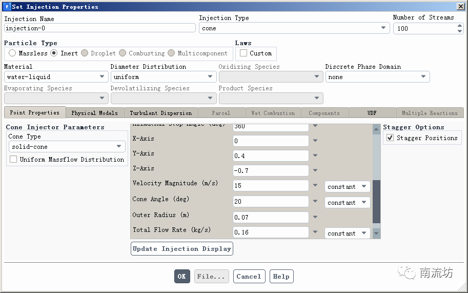 Injection Type选择cone,Material选择water-liquid,Y-position选择-0.45,Z-position选择2,Diameter填入0.0,01,Stop Time填入1000,cone angle填入20,outer diameter填入0.07,Total Flow Rate填入0.16,单击OK按钮确认并关闭对话框。
