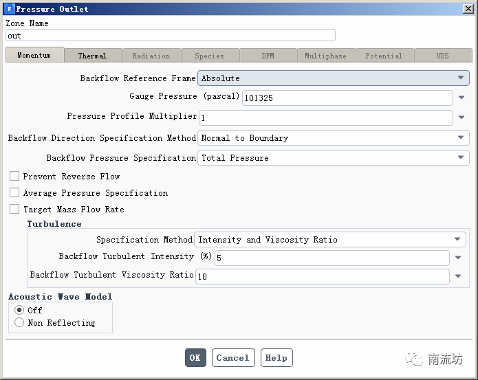 (1)在边界条件面板中,双击out和out2弹出边界条件设置对话框。Gauge Pressure输入101325,单击OK按钮确认退出。