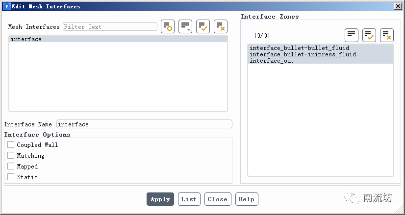 (1)单击主菜单中Domain→Interface→Mesh,弹出Mesh Interface对话框,设置Interface。