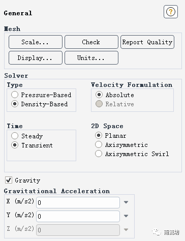 (2)单击命令结构树中General按钮,弹出General(总体模型设定)面板。在SolverTime中选择Transient,在Type中选择Density-Based。