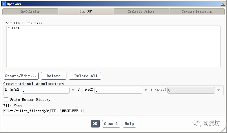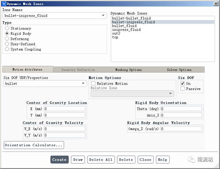 (2)在Dynamic Mesh面板,options中勾选Six DOF,单击Settings按钮弹出options对话框,分别创建Six DOF模型。