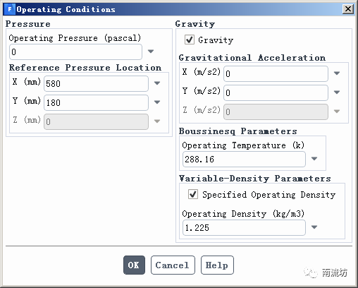 (1)单击主菜单中Setting Up Physics→Zones→Cell Zone Conditions面板。单击Operating Conditions按钮弹出Operating Conditions对话框,勾选Specified Operating Density,单击OK按钮并关闭对话框。
