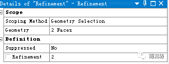 (4)右键单击模型树中Mesh选项,依次选择Mesh→Insert→Refinement,Refinement输入2。