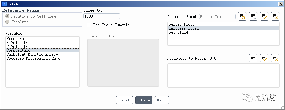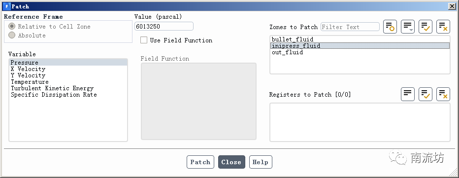 (2)在初始化设置面板,单击Patch按钮,弹出Patch对话框,在Variable中选择Pressure,Value中填入6013250,Zones to Patch中选择inipressure_fluid,单击Patch按钮。