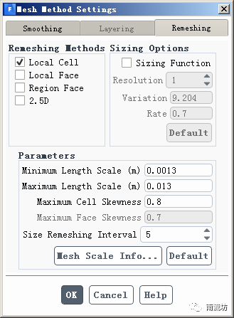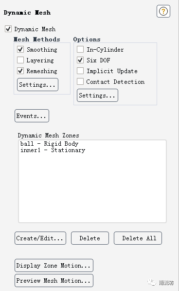 (1)双击Dynamic Mesh按钮,弹出Dynamic Mesh面板,勾选Dynamic Mesh,Mesh Methods中的Smoothing和Remeshing,单击Settings按钮弹出Mesh Method Settings对话框,设置Smoothing和Remeshing参数。
